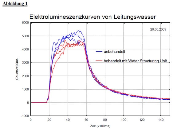Blue graph lines are normal tabwater and red one for structured water-we use the water in Prof. Popp’s laboratory, where I directly connected the unit to the water source. Distilled water would show effects in the same way, which means that our water has capsuled the micro-particles into clusters, so they can not react anymore.