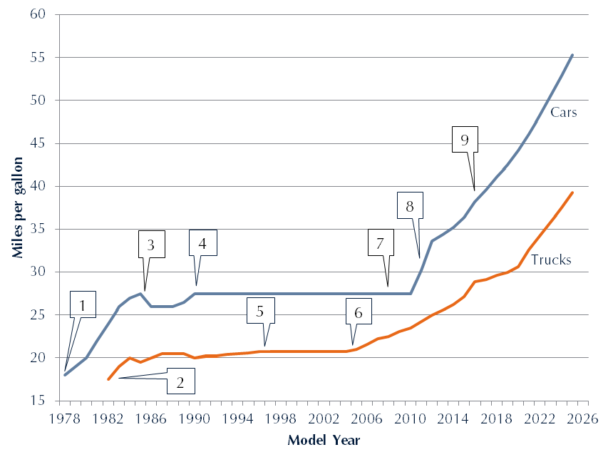 The chart below, from the Center for Climate and Energy Solutions, outlines the actual and projected rise in fuel economy standards for cars and trucks from 1978 through 2026.