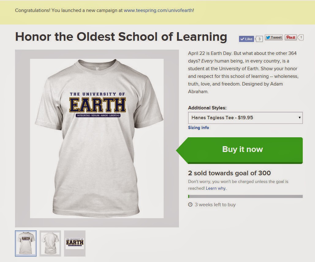 With that said, it’s my pleasure to introduce the University of Earth™ T-shirt, the first in a line of offerings under the trademark. I have just launched an introduction of the design via www.teespring.com, a “crowd funding” site created specifically for launching t-shirt designs.